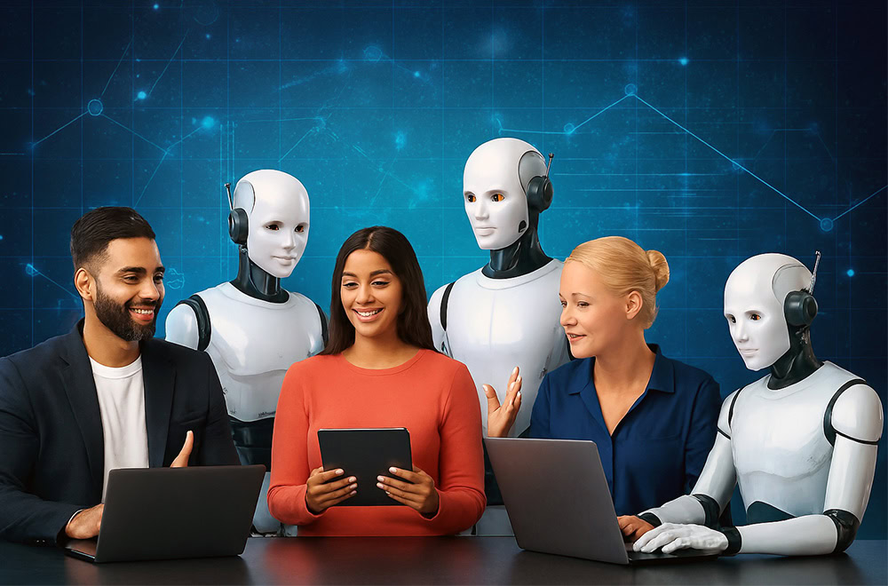 Ilustración en la que vemos robots acompañando a hombres y mujeres con sus laptops.